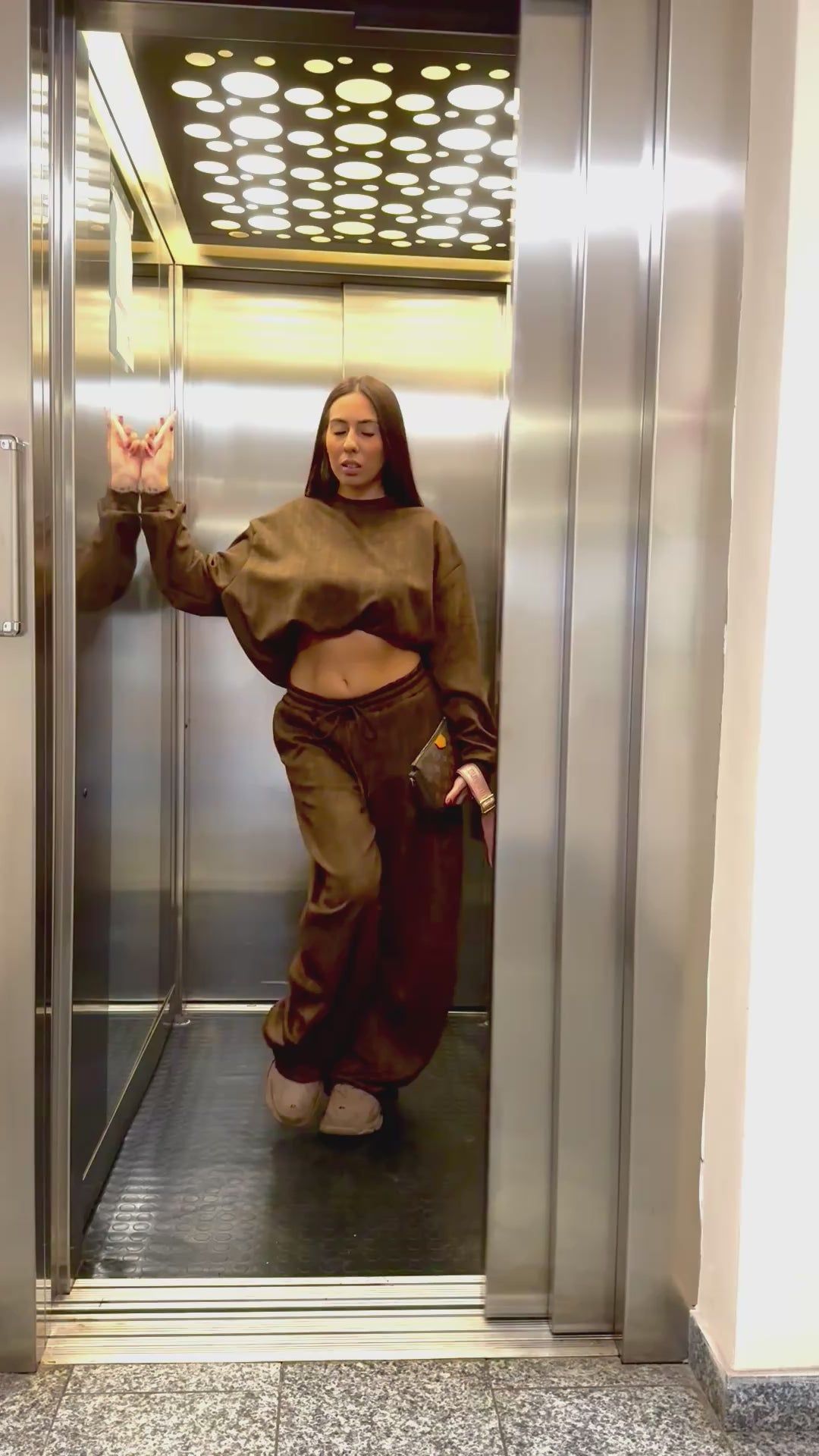 Felpa parte superiore Garzata del brand di Lumina, color Cacao con laminazione Oro. Taglia unica taglio over effetto rimborsato e scollo tondo. Veste da una S ad una L.