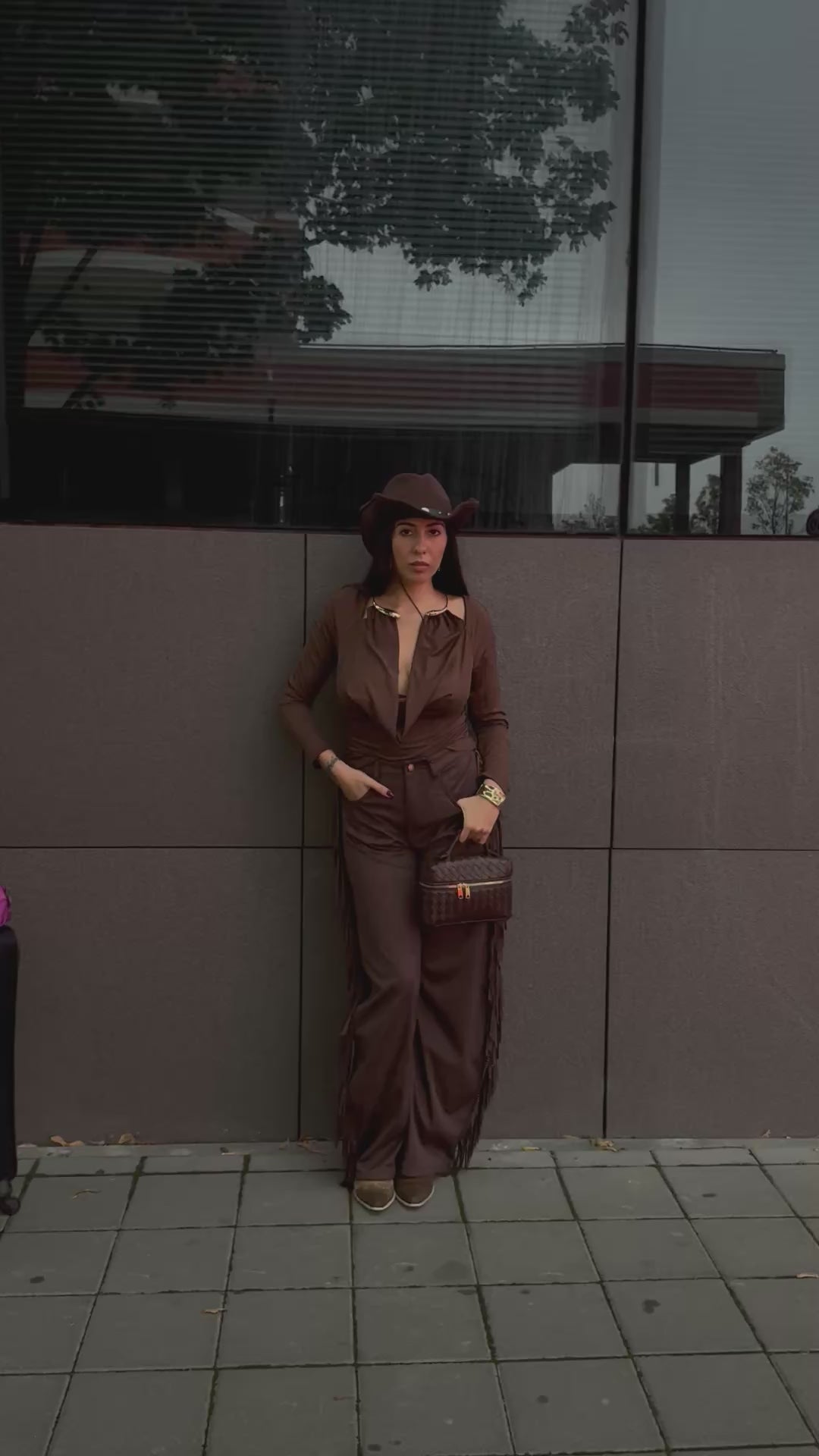 Pantalone in semilpelle scamosciata Marrone, vita alta, gamba Ballon con frange sul laterali. La modella indossa una S.