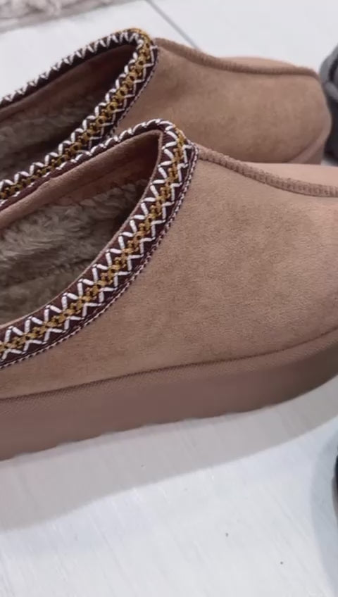 scarponcini stile “UGG” con pelo interno, platform e rifiniture sul gambale. Modello stile pantofola.