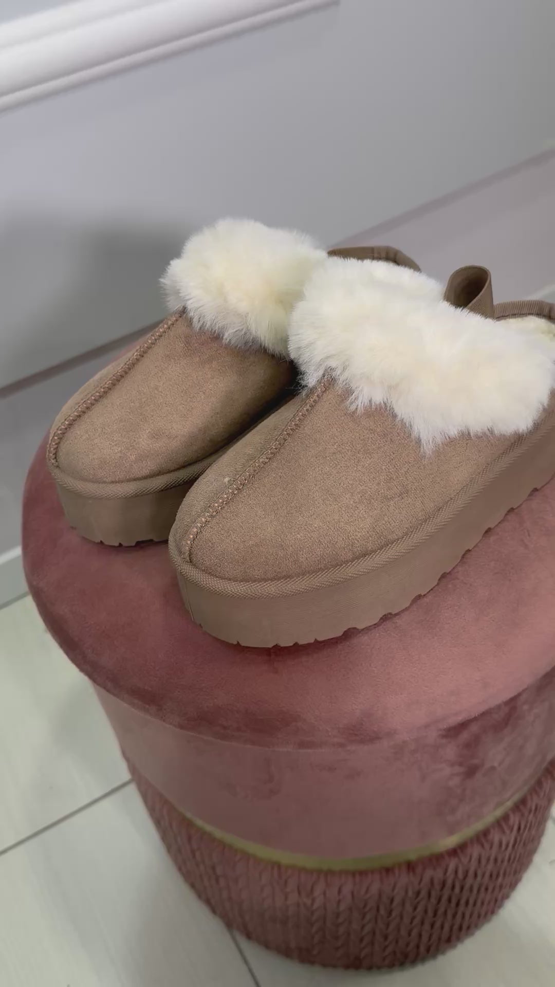 Scarpe stile scarponcino a ciabatta, con pelo bianco interno ed esterno. Color Khaki, con platform ed elastico sul retro.